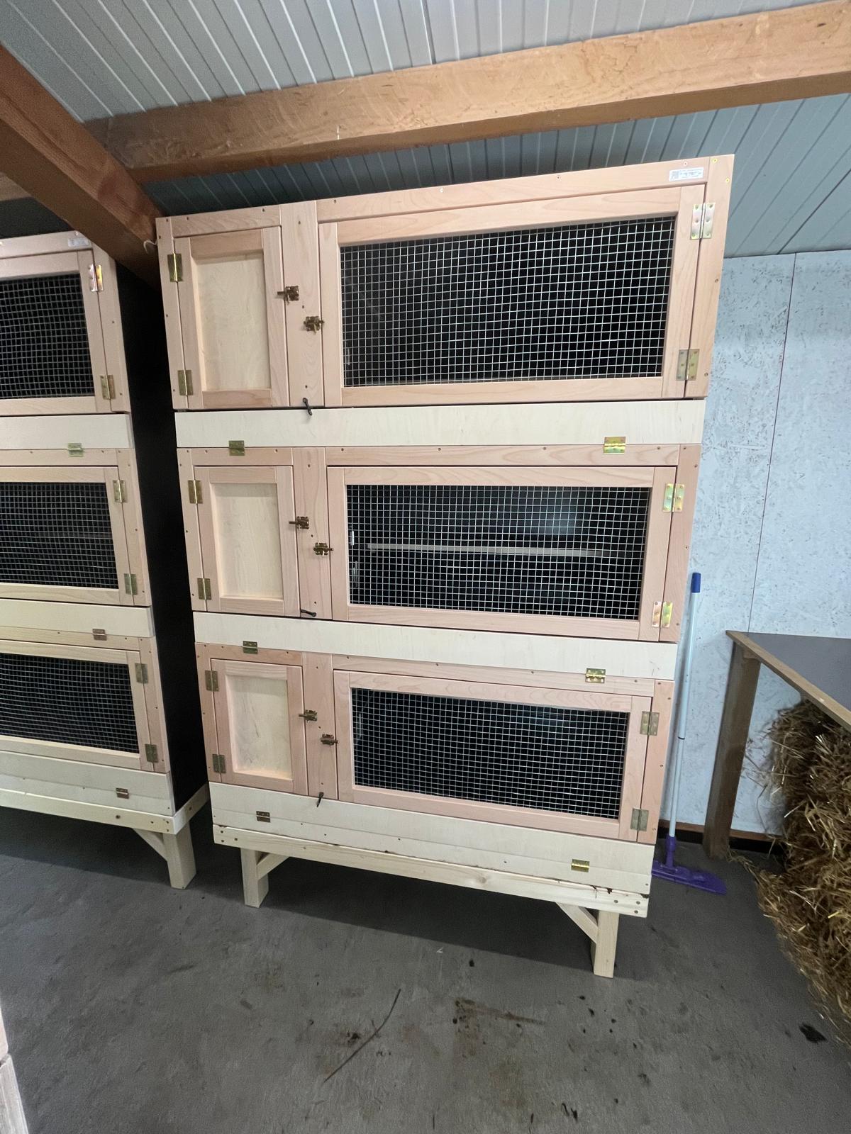 Kaninchenställe aus braunen Siebdruckplatten mit Kotwannen