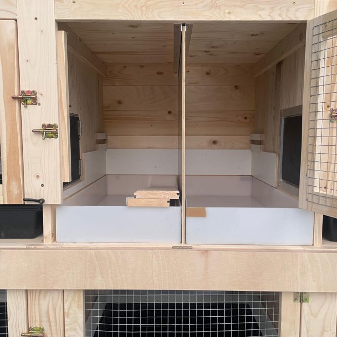 Die mittleren Boxen werden bei Bedarf durch eine 9mm Siebdruckplatte getrennt. Dort können dann zwei passende Kotwannen eingeschoben werden.